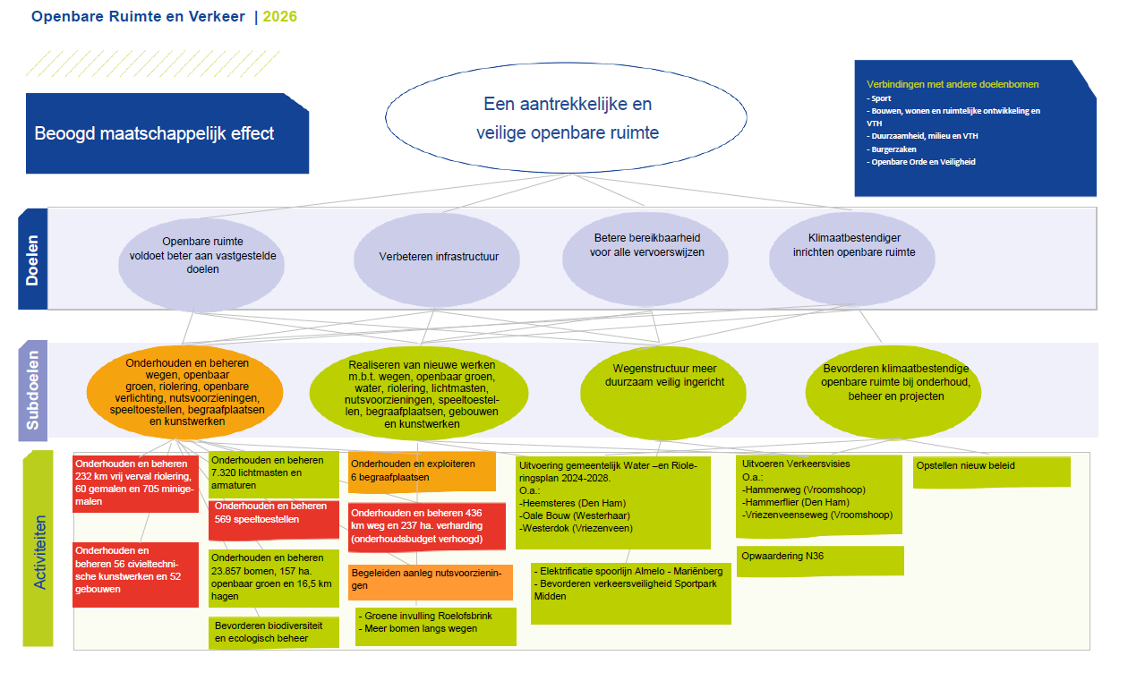 We stellen per taakveld (zoals groenonderhoud, wegen of riolering) vast welk kwaliteitsniveau we willen leveren en zorgen ervoor dat bereikbaarheid voor auto, fiets, bus en trein op peil blijft. Inwoners en raad weten daardoor wat ze kunnen verwachten. Soms leiden landelijke regels tot hogere kosten, zoals bij onkruidbestrijding. Daarnaast vraagt de benodigde, vervangende capaciteit bij de buitendienst vanwege de uitstroom WSW nog om nader onderzoek. Klimaatadaptatie wordt meegenomen bij werkzaamheden in de openbare ruimte en richten we wegen zo in dat ze veiliger worden, met als doel minder verkeersslachtoffers. De door de raad aangenomen moties vragen om nadere uitwerking voor het planten van meer bomen en vergroening van bepaalde gebieden.